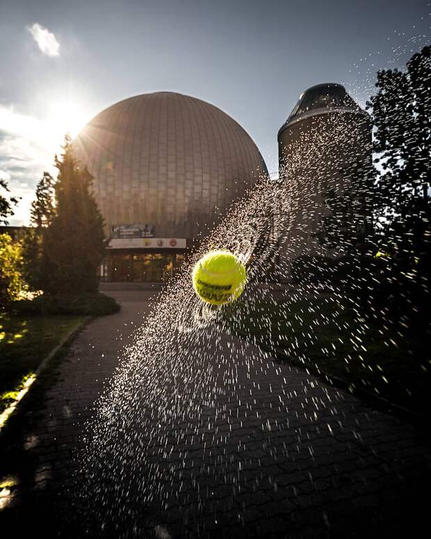 Для такого фото мяч нужно намочить, закрутить и подбросить